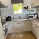 Оборудованная кухня удобно оборудована электрочайником, холодильником и духовкой.